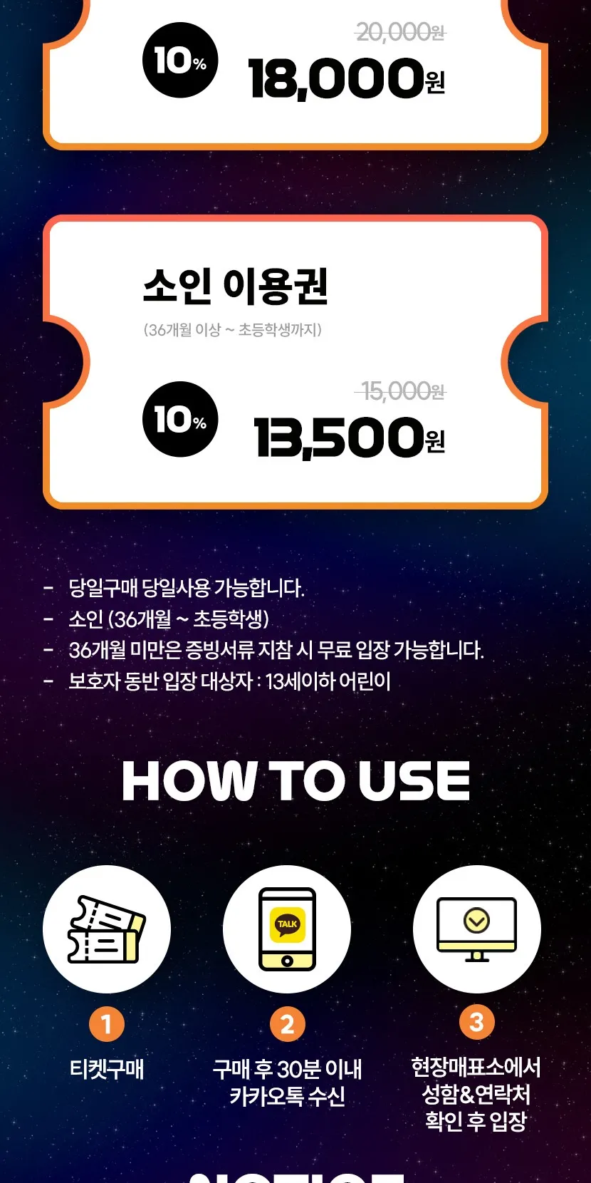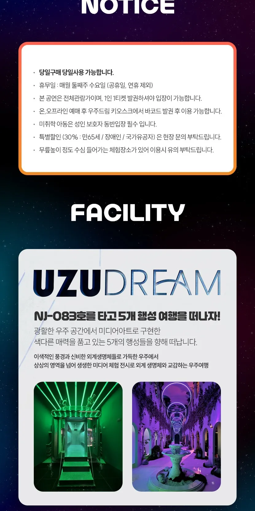 - 온, 오프라인 예매 후 우주드림 키오스크에서 발권 후 이용 가능합니다.