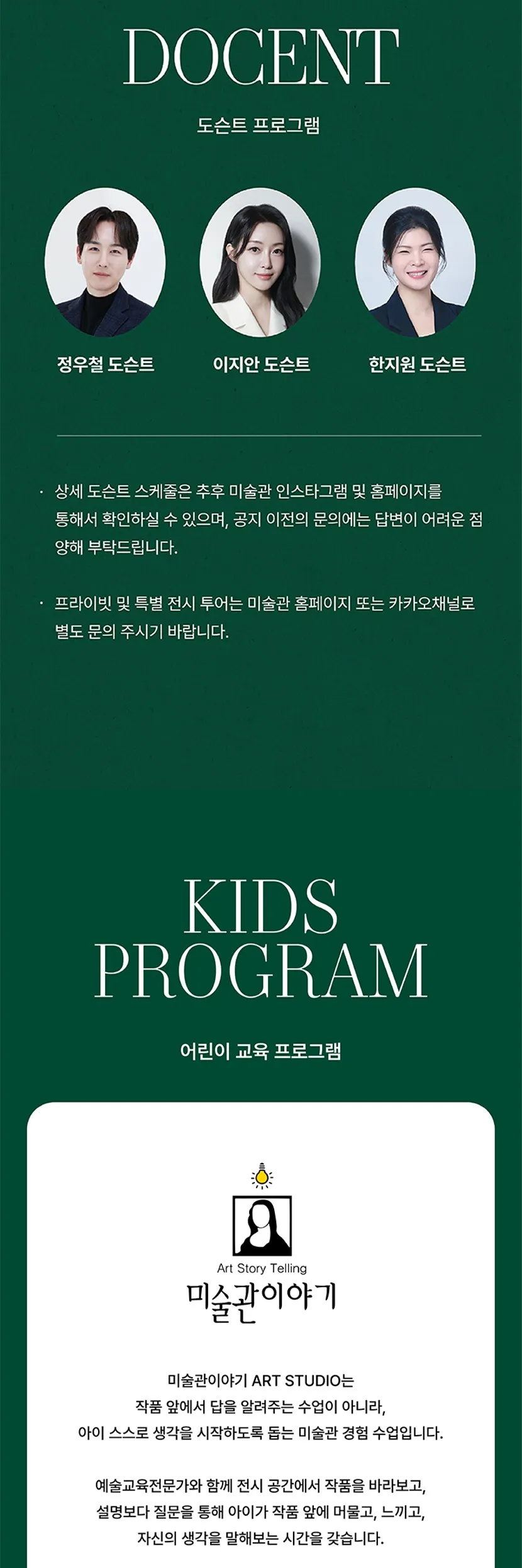 - 정규 도슨트는 평일에만 운영되며, 주말 및 공휴일에는 운영되지 않습니다.