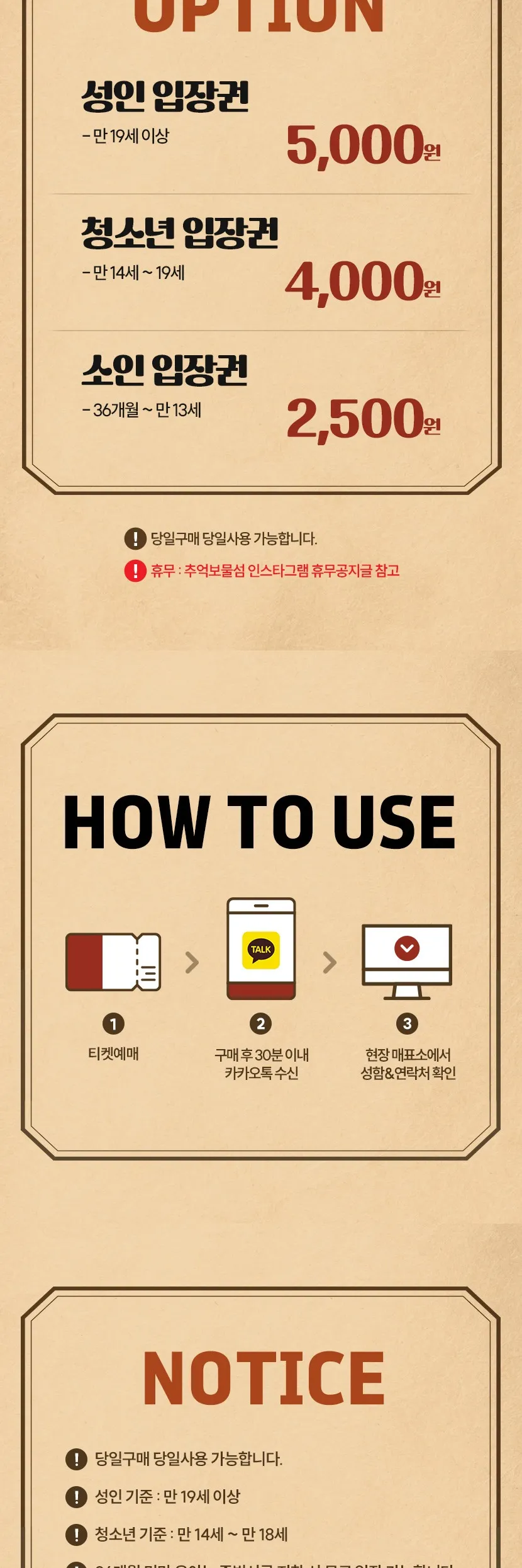 - 36개월 미만 유아는 증빙서류 지참 시 무료 입장 가능합니다.