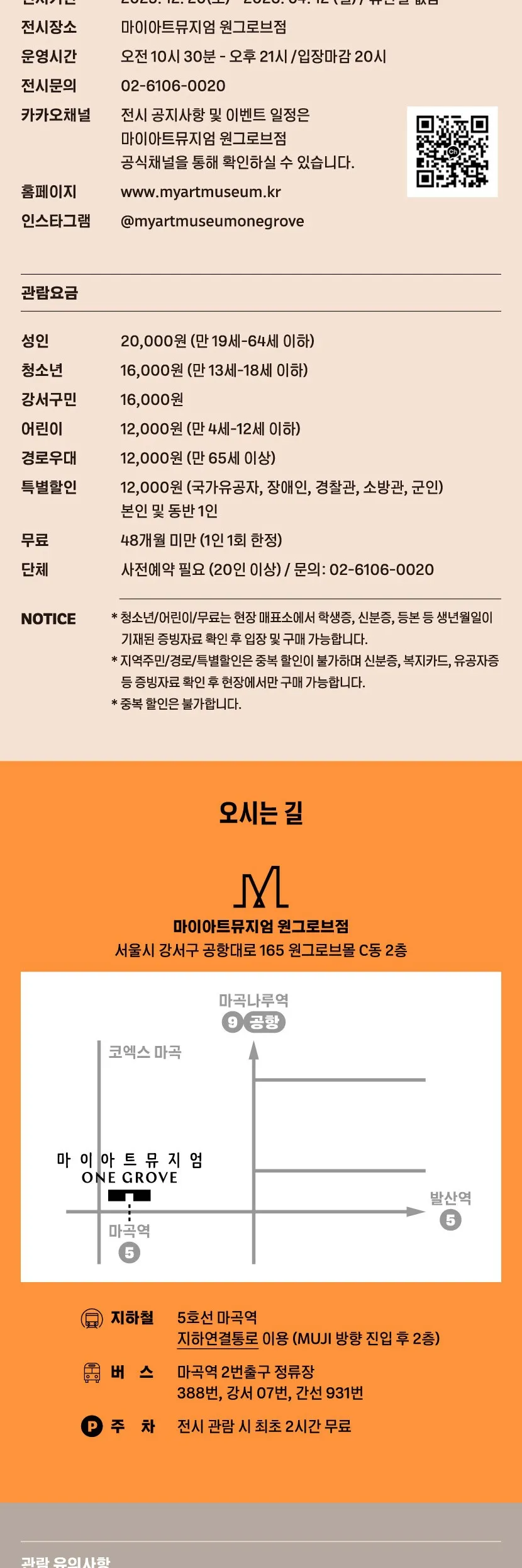 - 전시 및 도슨트 공지사항은 마이아트뮤지엄 원그로브점 인스타그램 및 홈페이지에서 확인하실 수 있습니다.