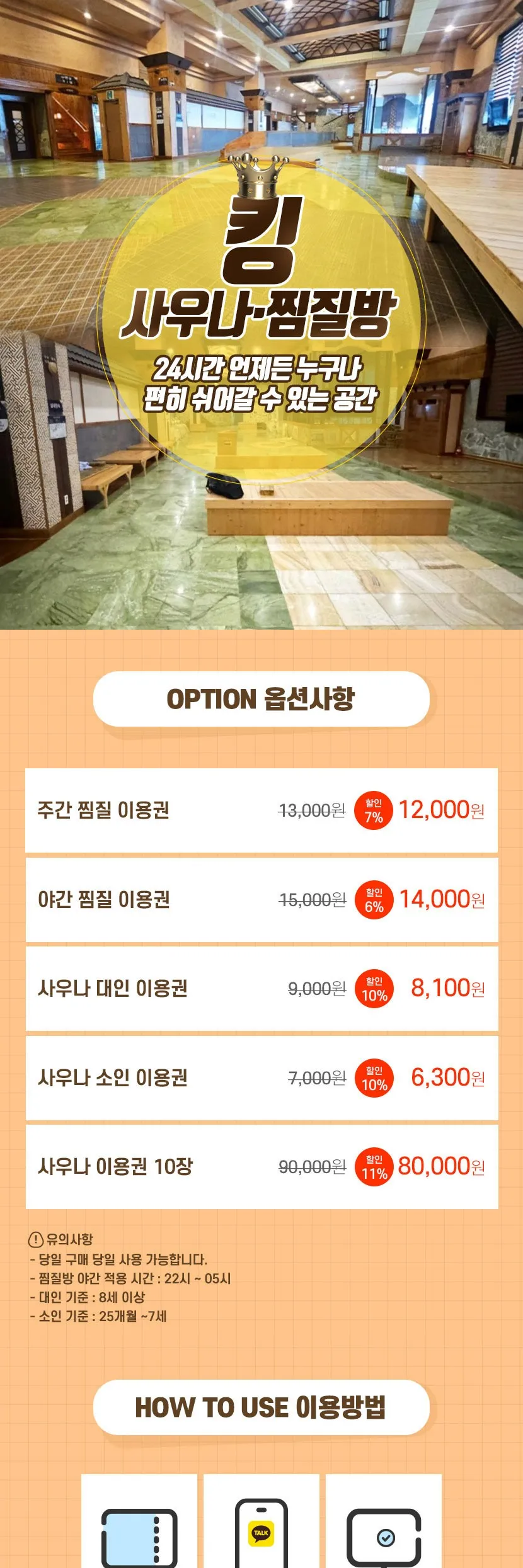 - 무료주차 이용권 : 사우나 3시간 / 찜질방 12시간
