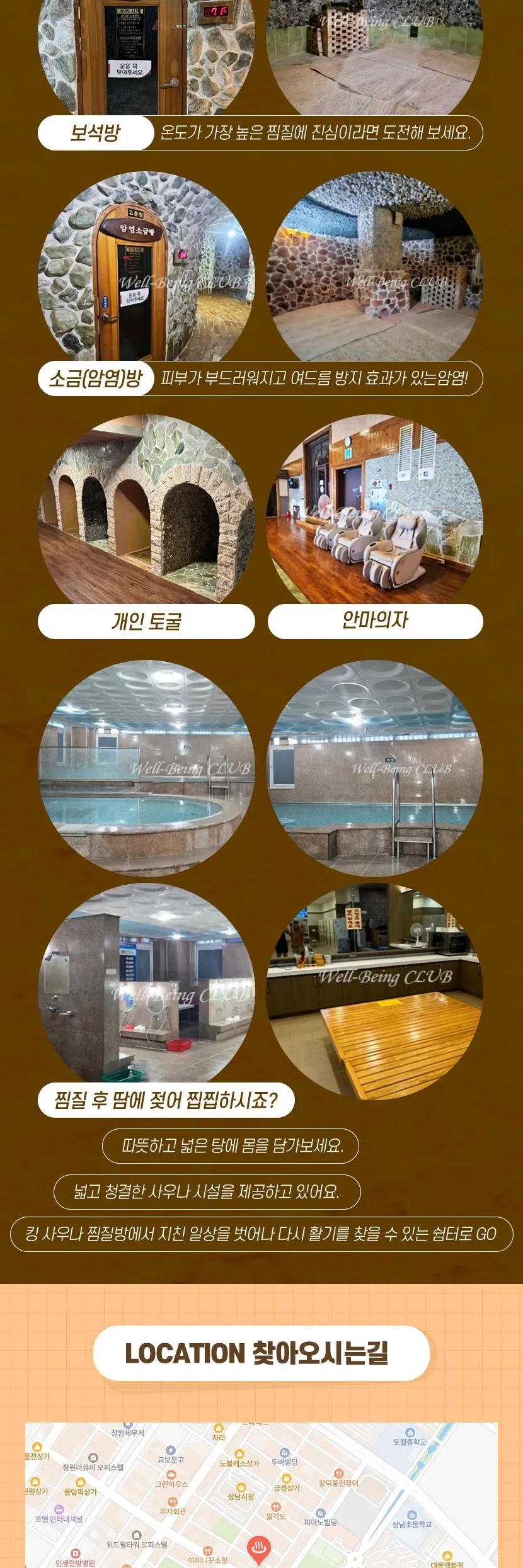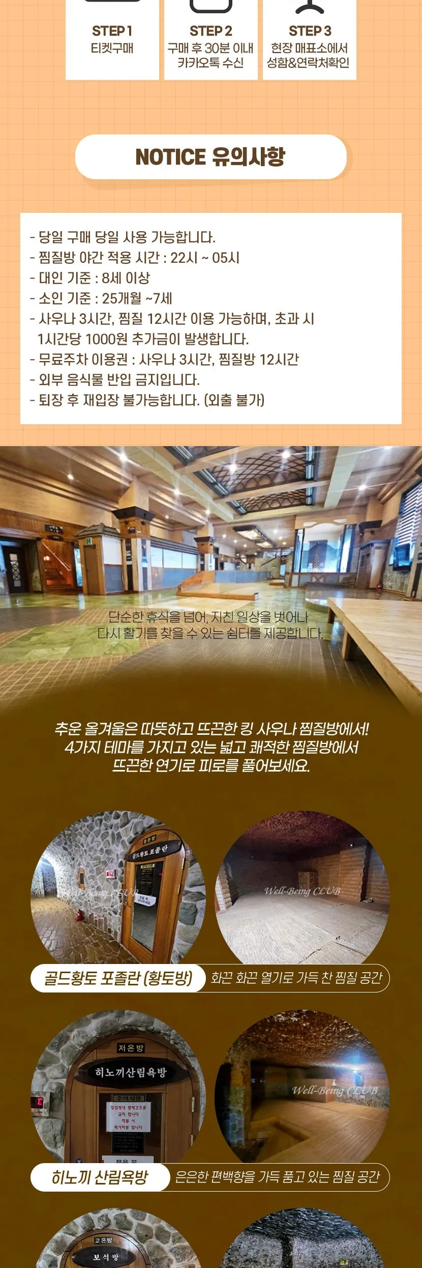 - 사우나 3시간 / 찜질 12시간 이용 가능하며, 초과 시 1시간당 1,000원 추가금 발생합니다.