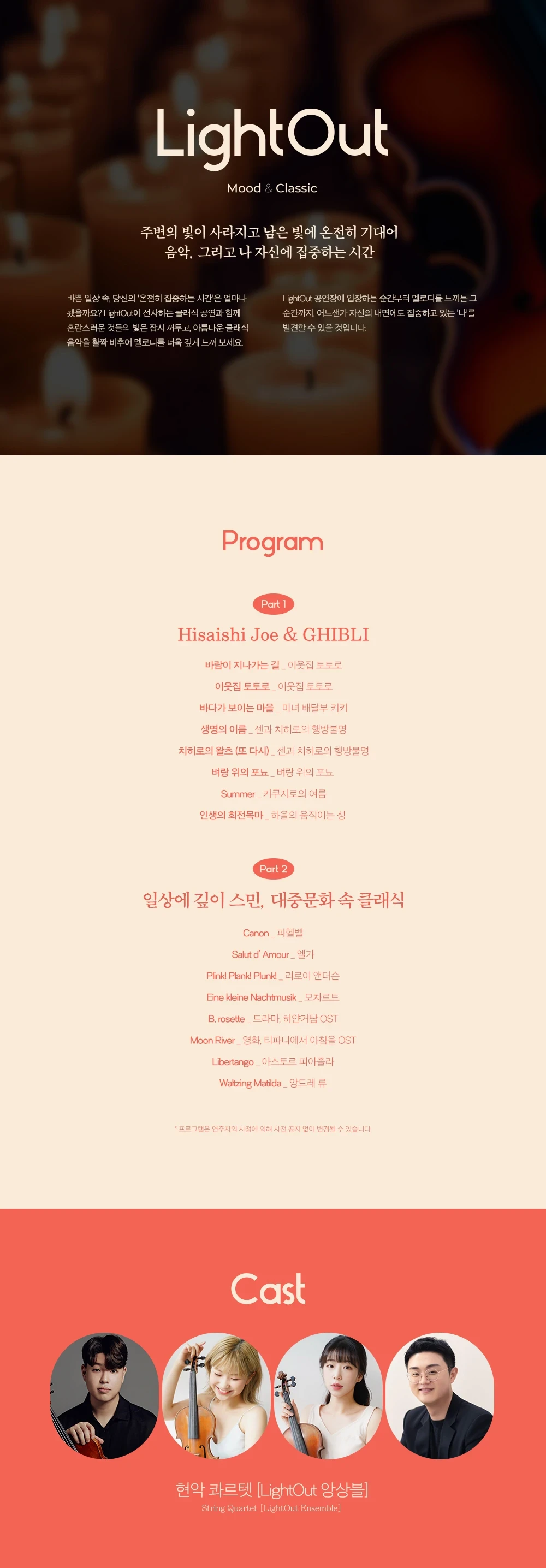 - 본 공연은 1부와 2부 사이 인터미션 없이 진행됩니다. 티켓 예매 시 참고해 주시기 바랍니다.