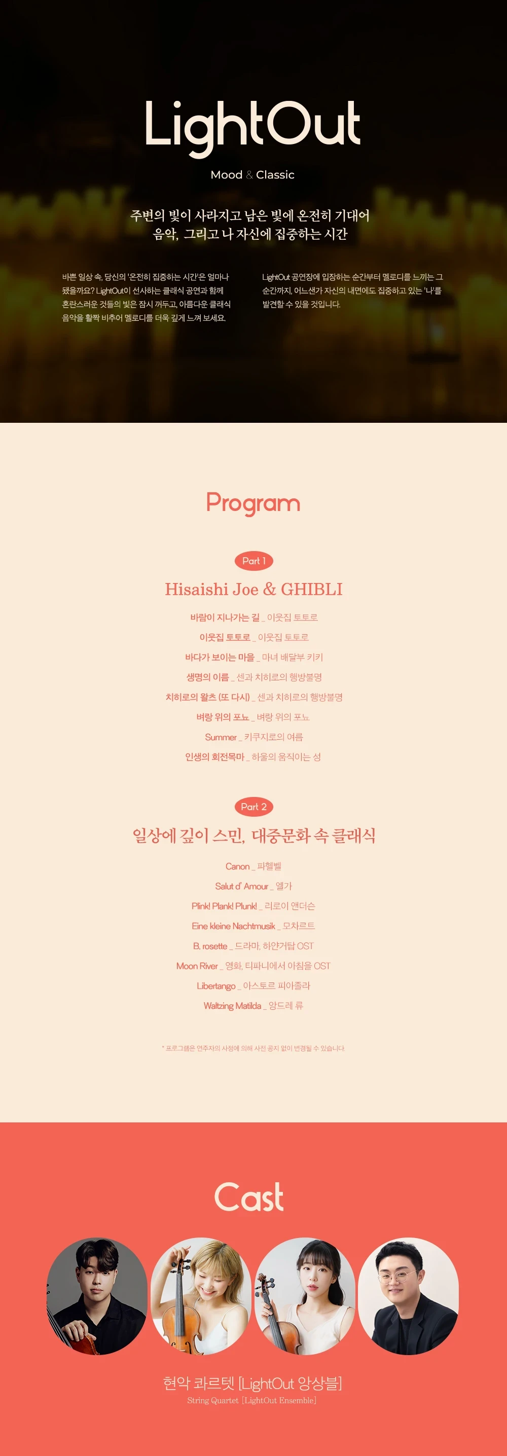 - 본 공연은 1부와 2부 사이 인터미션 없이 진행됩니다. 티켓 예매 시 참고해 주시기 바랍니다.