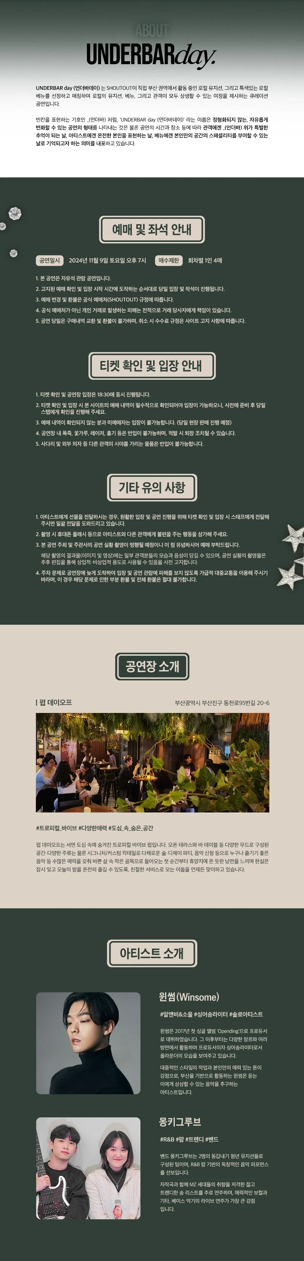 - 본 공연은 자유석 공연으로, 아래 고지된 예매 확인 및 입장 시간에 도착하는 순서대로 당일 입장 및 착석이 진행됩니다.