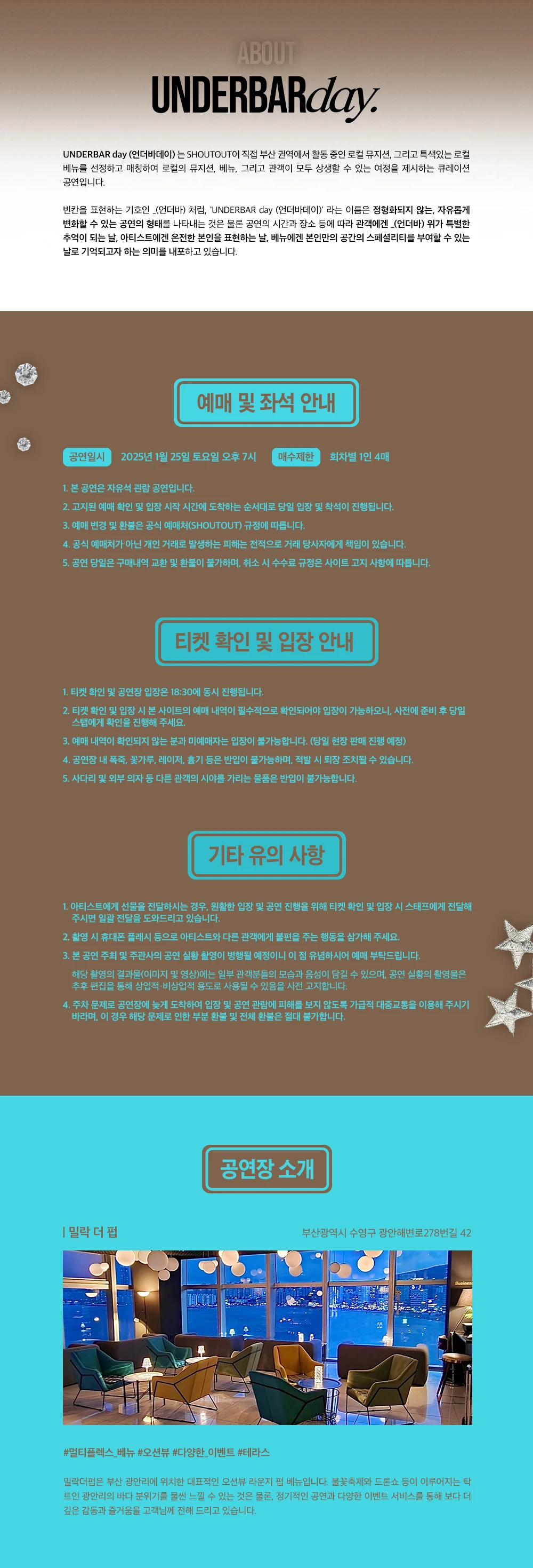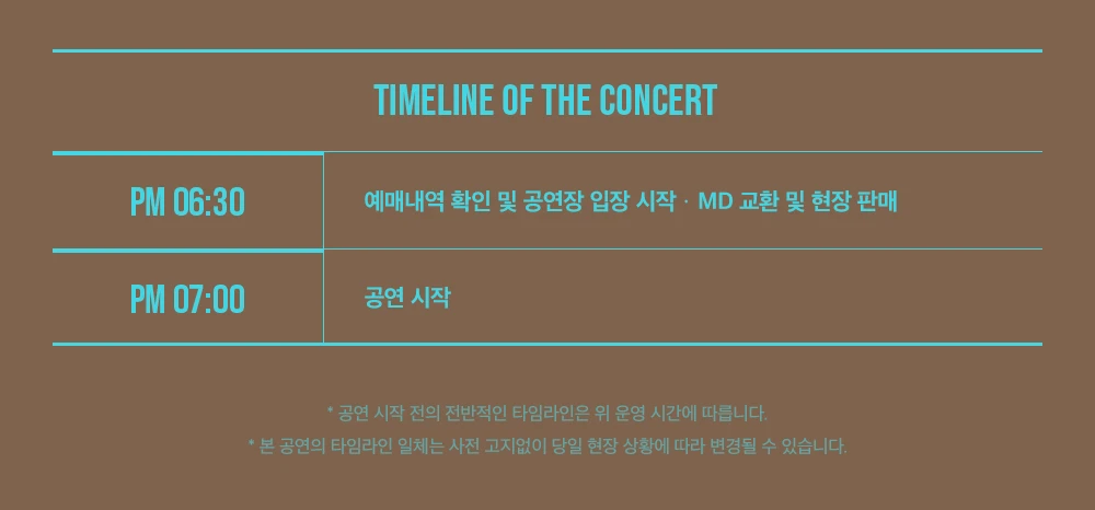 ┕ 공연장 입장은 30분 전부터 가능하며, 티켓 구매 내역 확인과 입장이 동시에 이루어질 예정입니다.