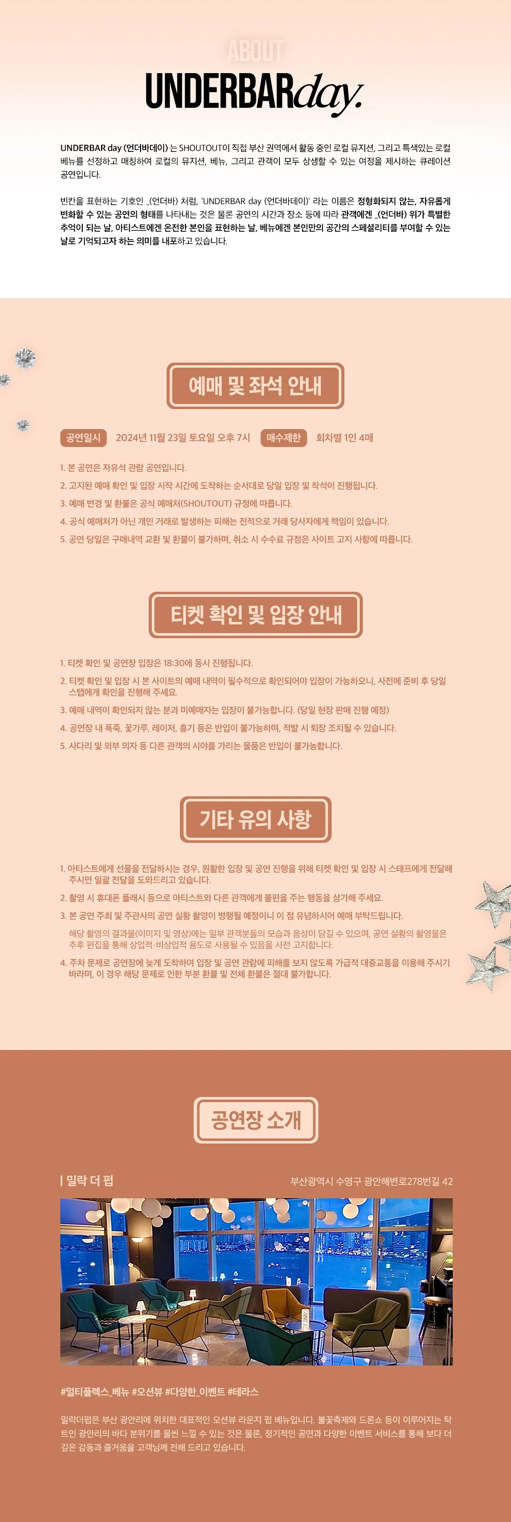 - 공연 당일 티켓 수령 시 SHOUTOUT 내에서 구매한 예매 내역 확인 후 수령이 가능합니다. 원활한 티켓 수령을 위해 예매 내역서를 필히 지참해 주세요.