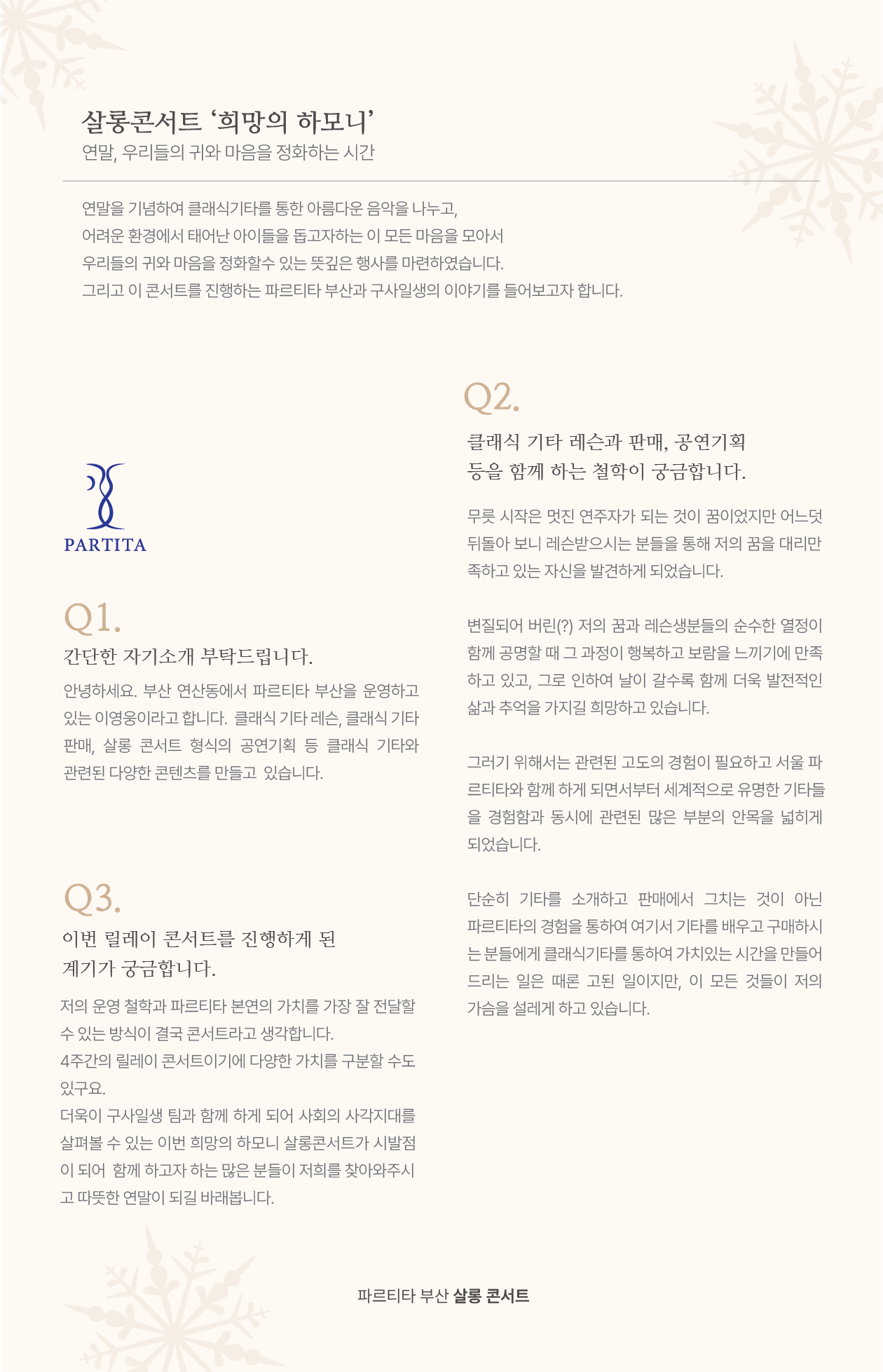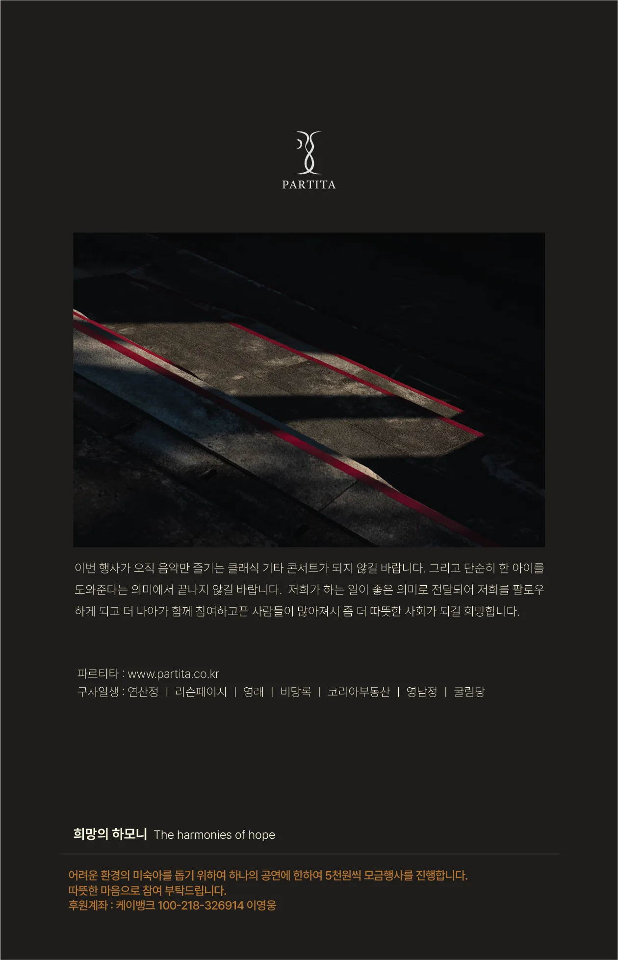 우리나라 클래식기타 문화를 선도하는 그룹 파르티타는 클래식기타라는 악기의 아름다움을 알리고자 해마다 다양한 형식의 클래식기타 콘서트를 진행하고 있습니다.