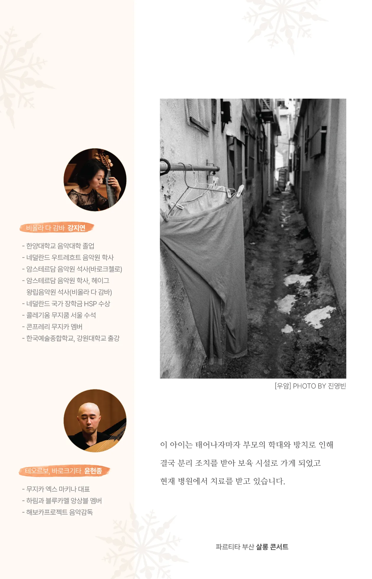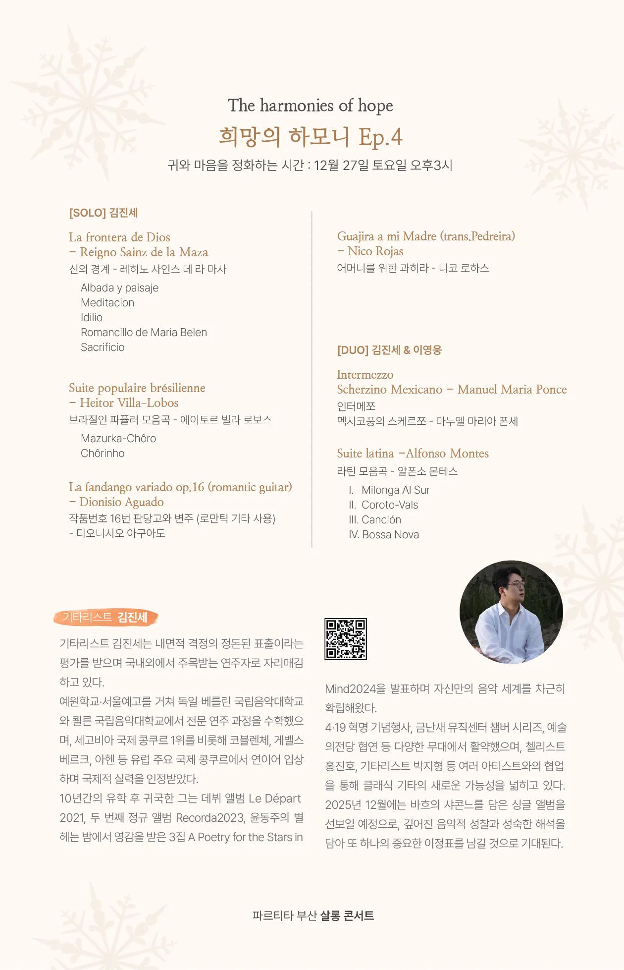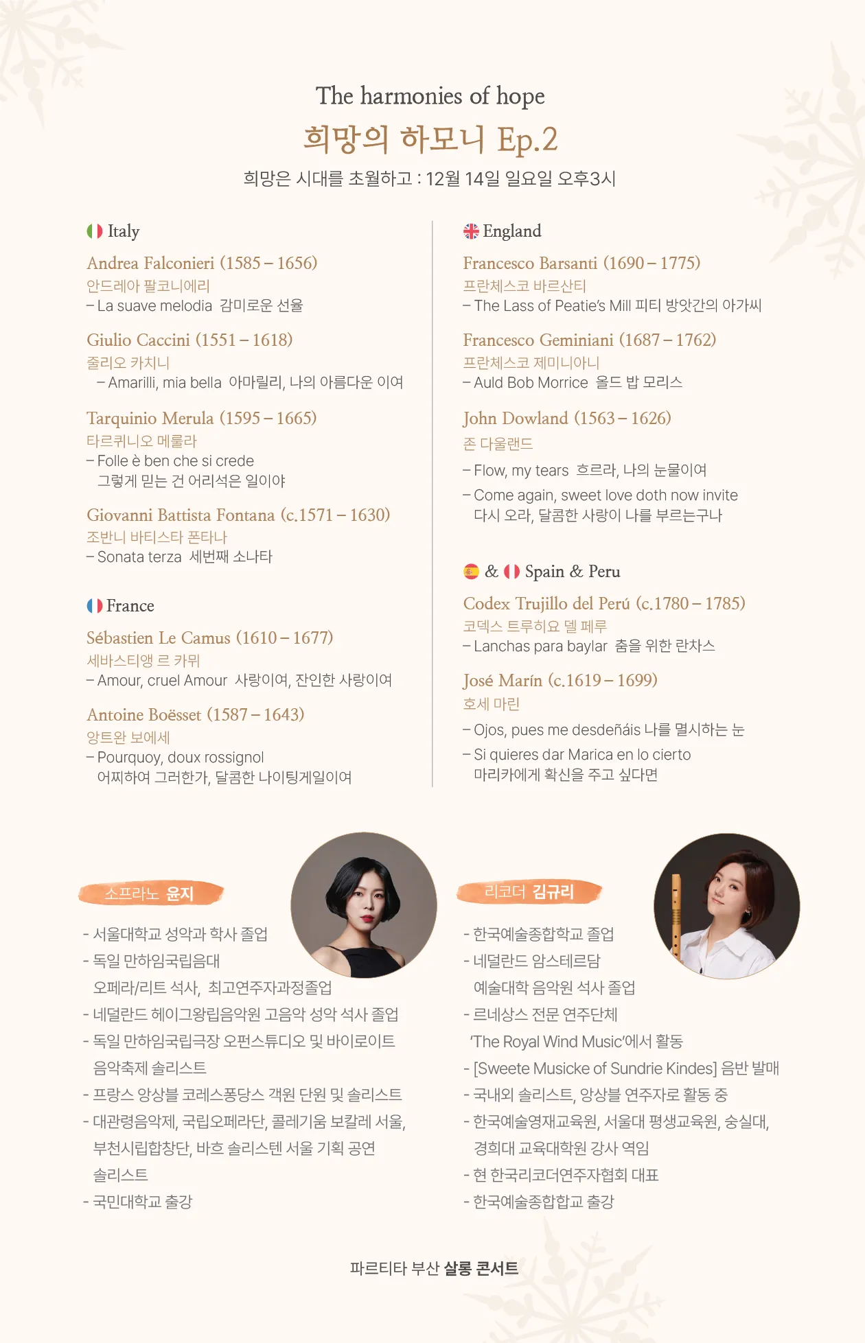 이상 공연을 연말을 맞이하여 주말마다 진행하는 릴레이 살롱콘서트 형식으로 준비하였습니다.